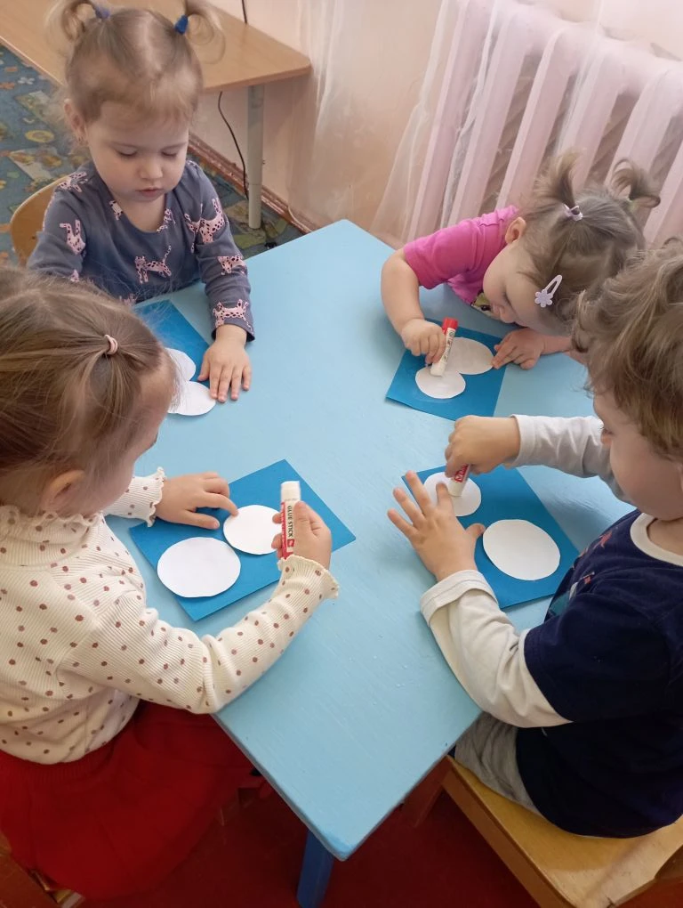 А в ясельной группе прошло занятие по аппликации, на котором дети учились "лепить" снеговиков.