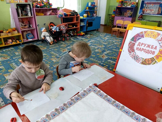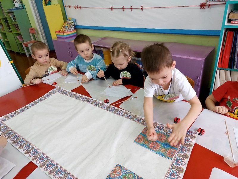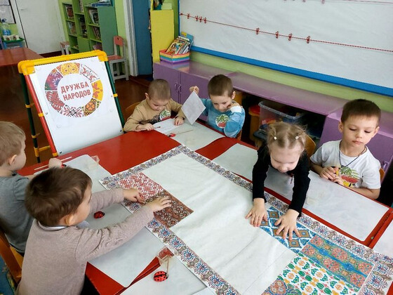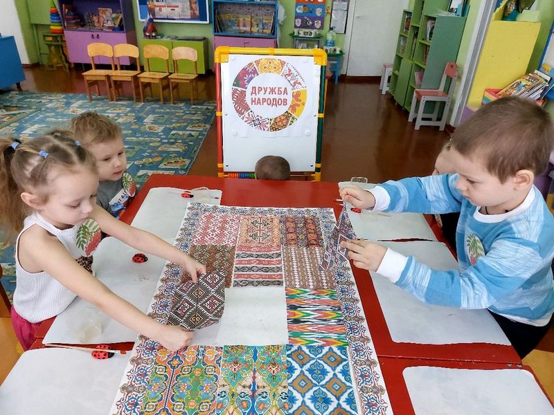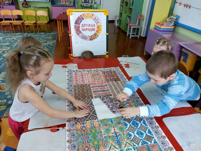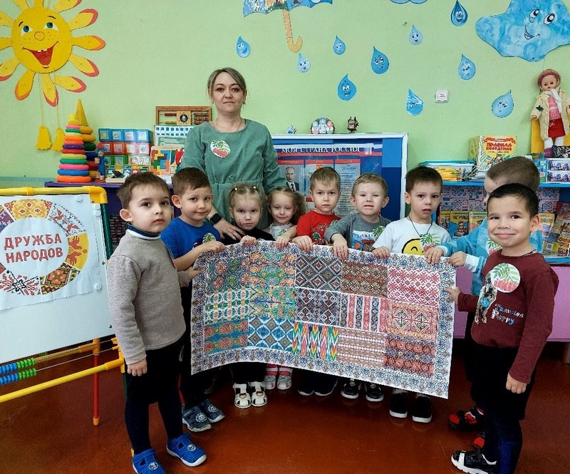 «Лоскутное одеяло дружбы» В Год единства будем рядом, С целью воспитания у ребят средней группы чувства патриотизма, уважения к культурным традициям народов, населяющих Россию. Укрепления дружеских связей между детьми, воспитатель Федосеева Юлия Владимировна провела занятие по коллективной аппликации. Ребятам было предложено создать "Лоскутное одеяло дружбы". А чтобы сделать это было проще, им в ходе беседы было дано объяснение с опорой на наглядность, что национальный орнамент, это узор, элементы которого повторяются. Также вспомнили некоторые поговорки, которые отображают в себе национальную мудрость и культурные ценности. «Сила жизни — в дружбе». «Тело украшает одежда, а душу украшает дружба». «Дружба и братство — лучше богатства». «В дружбе легче жить», эту поговорку подтверждает и сказка В. Сутеева о двух друзьях: Цыплёнке и Утенке, которые дружат с самого рождения, разделяют всё: радость познания мира, еду, но даже в дружбе важно сохранять свою собственную личность. А затем работа закипела, ребята старательно наносили клей на подготовленные «лоскутики» и приклеивали их на коллективную основу. В итоге у них получилось яркое, с орнаментом разных национальностей «Лоскутное одеяло дружбы, как символ единства многонационального народа России. Мы призываем всех людей планеты, | |