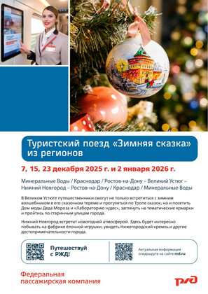 Внимание, жителей Юга России! Туристский поезд «Зимняя сказка из регионов» отправляется в Великий Устюг и Нижний Новгород! Согласно письму Минобразования Ростовской области и Северо-Кавказского филиала АО «ФПК», в декабре 2025 и январе 2026 года из Минеральных Вод стартуют специальные рейсы туристского поезда: Даты отправления: