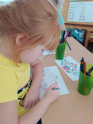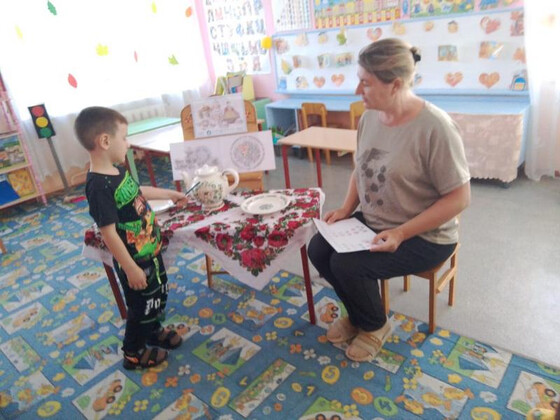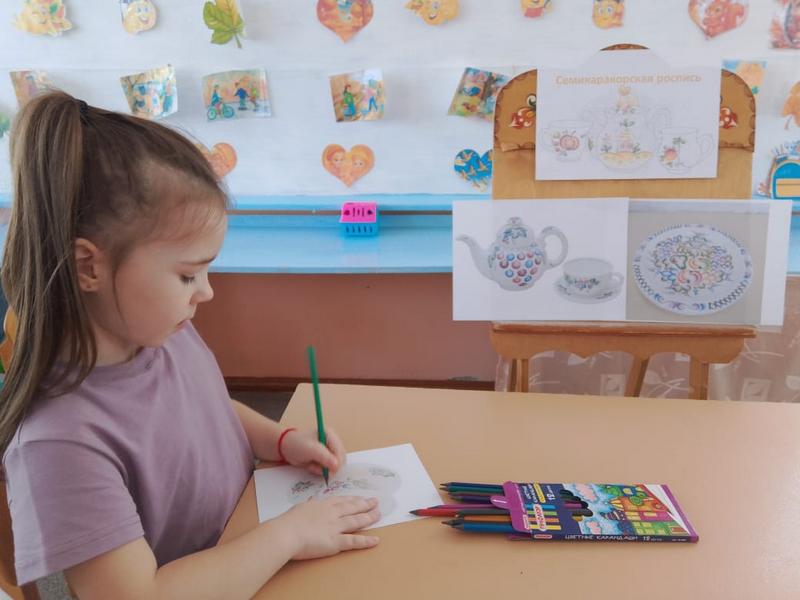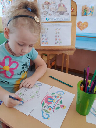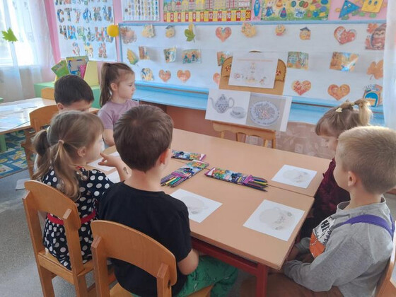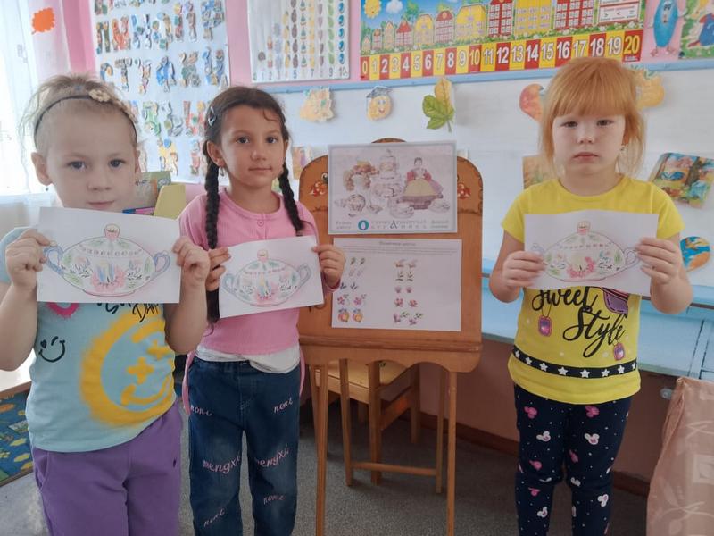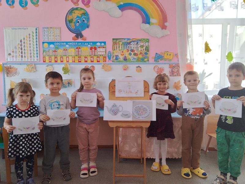 Цель: расширить представления дошкольников о семикаракорской росписи и искусстве донских мастеров. Всю неделю дети старшей группы «Воробушки» знакомились с народным промыслом — семикаракорской керамикой. Воспитатель Евгения Николаевна показала детям презентацию, из которой они узнали, что изделия изготовлены из особой белой глины. В основу росписи вошли степные растения Донского края с некрупными соцветиями. Весь цвет Донской земли впитал в себя Семикаракорский фаянс. Все эти цветы словно подернуты лёгкой дымкой! Ведь в наших донских степях иначе и не бывает: солнце так палит, что вся степь покрыта маревом! Обследовав фаянсовые изделия, юные мастера с большим интересом принялись расписывать бумажную посуду. Для выполнения мазка на кисть набирается краска двух цветов — в этом и заключается самобытность семикаракорской росписи. В конце занятия была устроена выставка рисунков. Очень важно воспитывать у детей любовь и уважение к традициям, культуре и искусству донских мастеров. | |